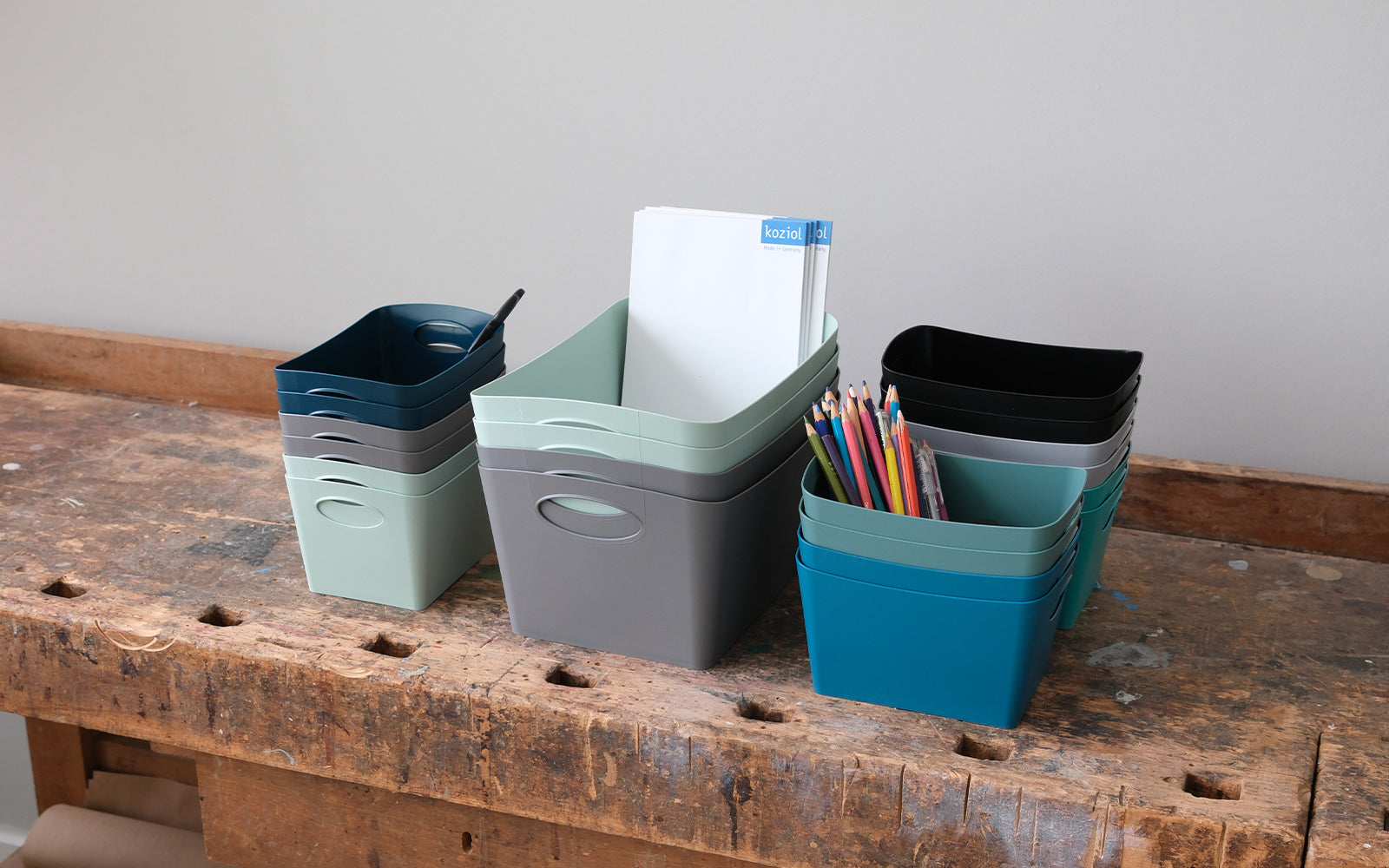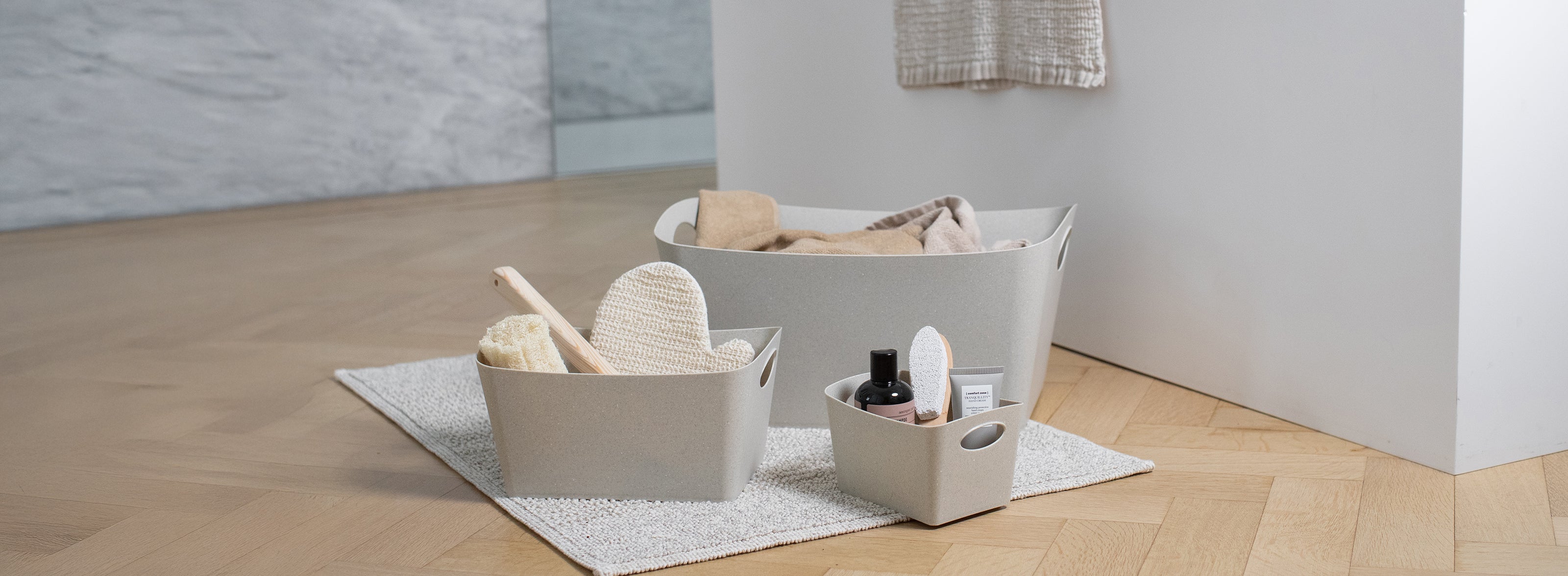 Bringe Ordnung in dein Badezimmer mit Zubern, Boxen und Utensilos für Schränke und Duschkabine. Unsere Aufbewahrungslösungen bestehen aus recyceltem oder biozirkulärem Material und bieten Platz für Pflegeprodukte & Badutensilien.