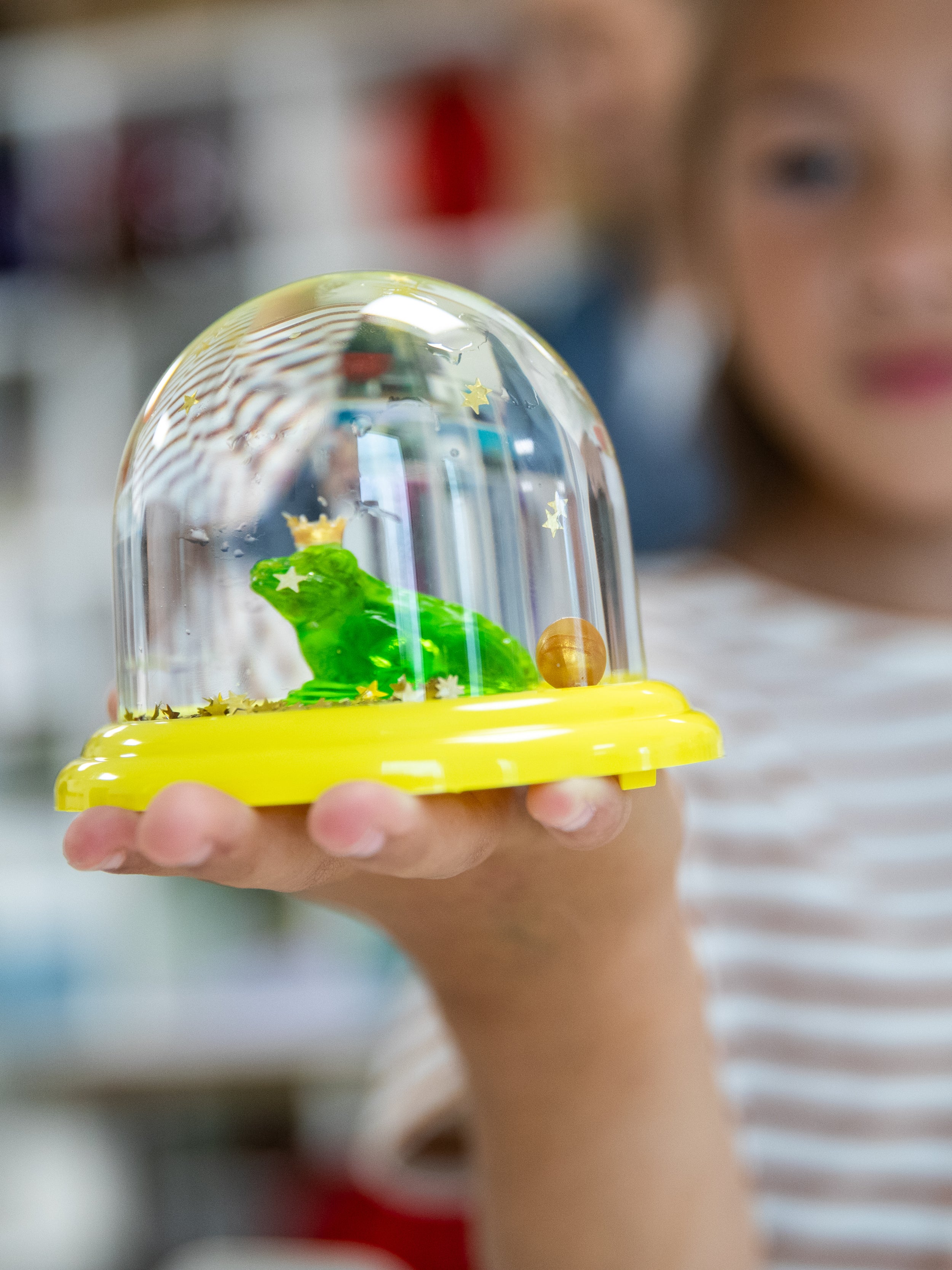 Ablauf: Traumkugeln bestehen aus Boden, Kuppel und Figur, die im Workshop selbst ausgewählt und zusammengesetzt werden dürfen. Es gibt Figuren und verschiedene Schwebeteile wie Schnee, Silberflitter und fluoreszierenden Glitter in Hülle und Fülle zur Auswahl. Wer mag, kann auch seine eigene Figur mitbringen*. Im nächsten Schritt wird die Kugel mit geheimem Zauberwasser gefüllt und fest verschlossen.