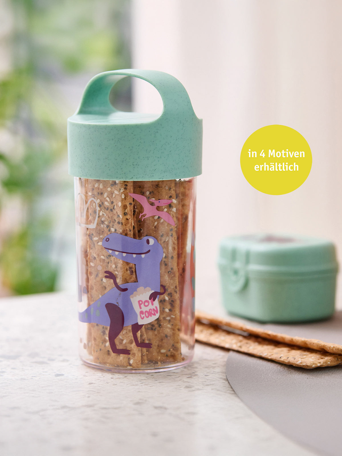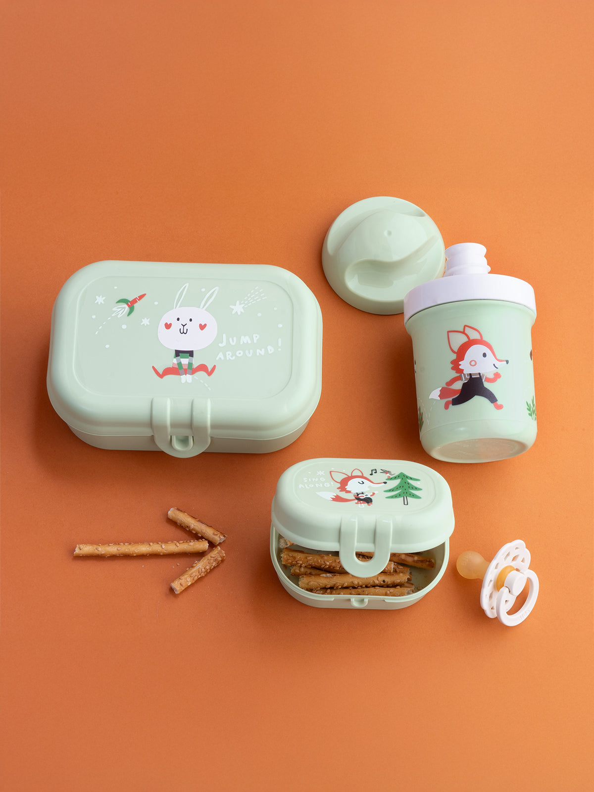 Häschen hüpf! Das Set bewahrt Obst, Gemüsesticks, Nüsse und Kekse frisch und appetitlich auf und ist perfekt für den kleinen Snack unterwegs.