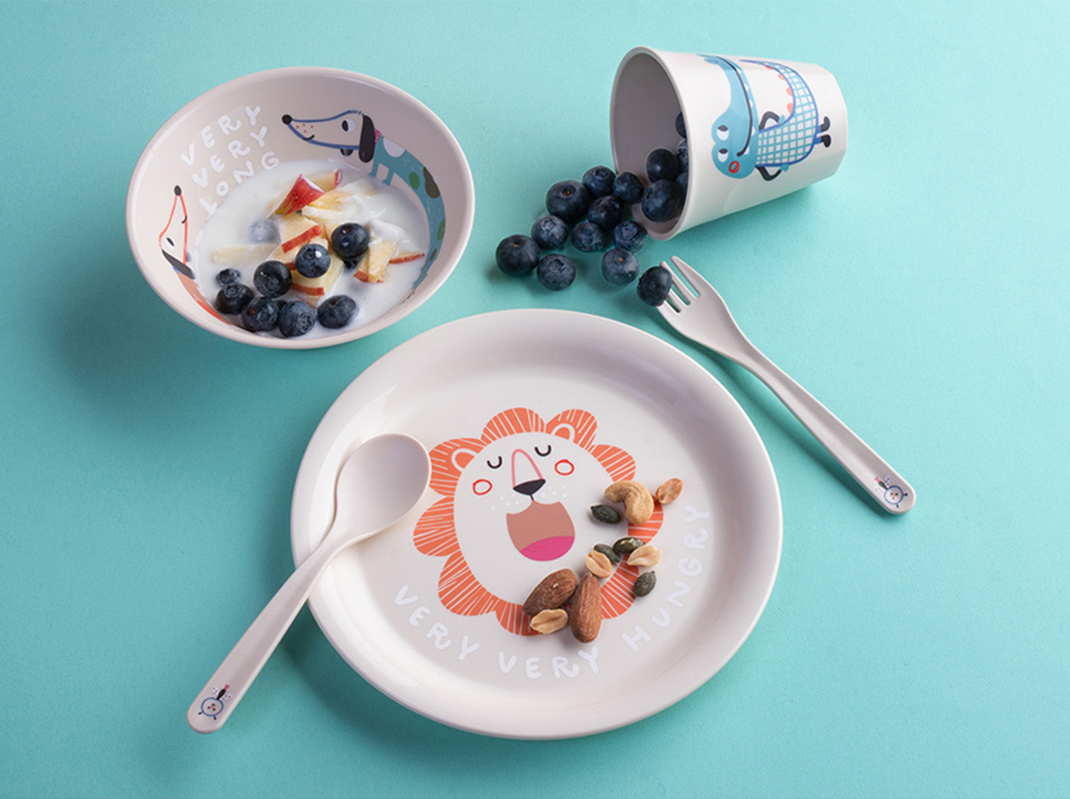 This cheerful collection is designed and built for children. The items are indestructible, stackable to save space, and if something falls, nothing is guaranteed to break!