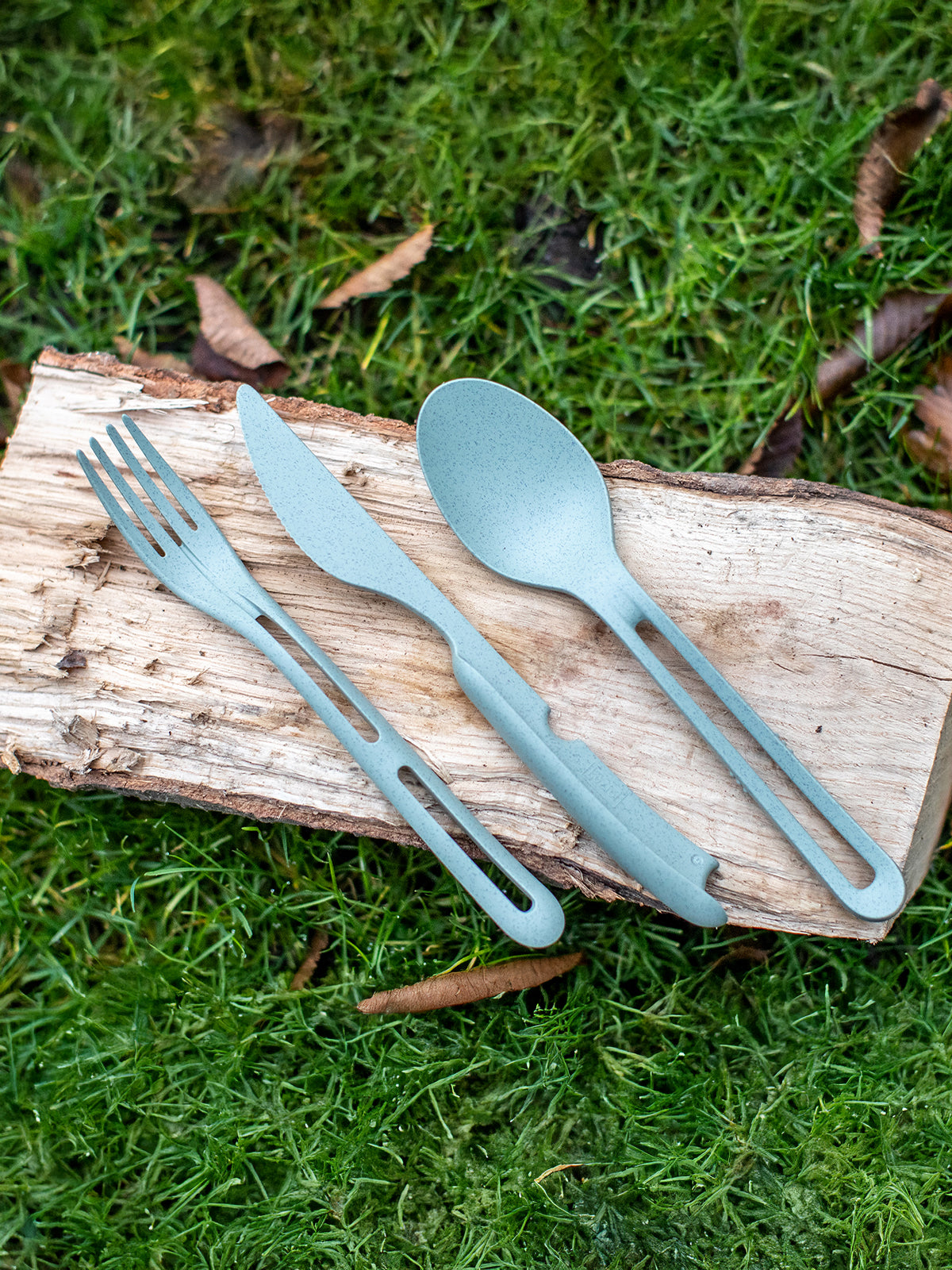 Knife, fork, spoon - that's it. Finally, there's a sensible, no-nonsense, and decently sized to-go cutlery set. No more balancing food to your mouth! All the pieces fit together and disassemble without much guesswork. To release, simply lift the knife at the tip and pull it down. All the cutlery pieces fit comfortably in your hand and, thanks to their lightweight design, fit in any bag.