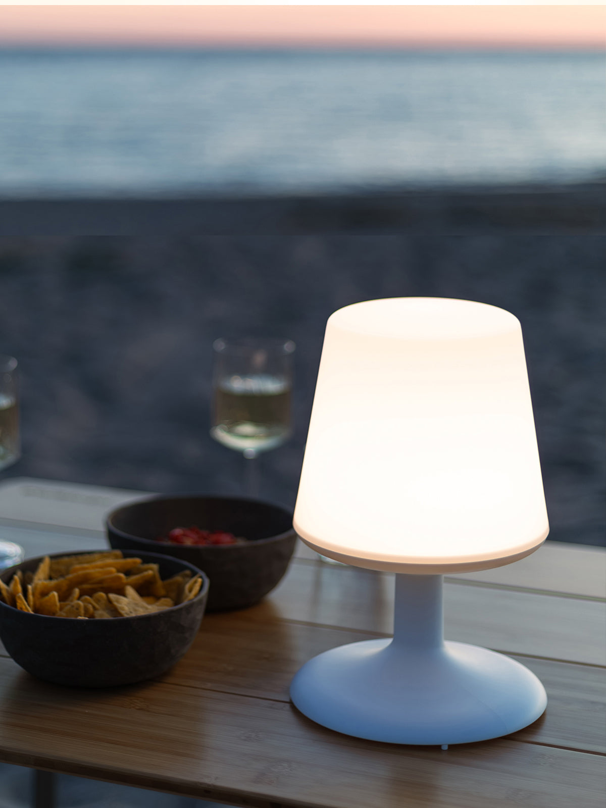 Light to go. This lamp accompanies us wherever flexible lighting is needed. The integrated power bank provides up to 14 hours of light and is charged via a USB cable. Ideal for any place without a power connection, such as the garden, on the balcony, or while glamping. It can also provide a short-term power boost for your cell phone in an emergency.