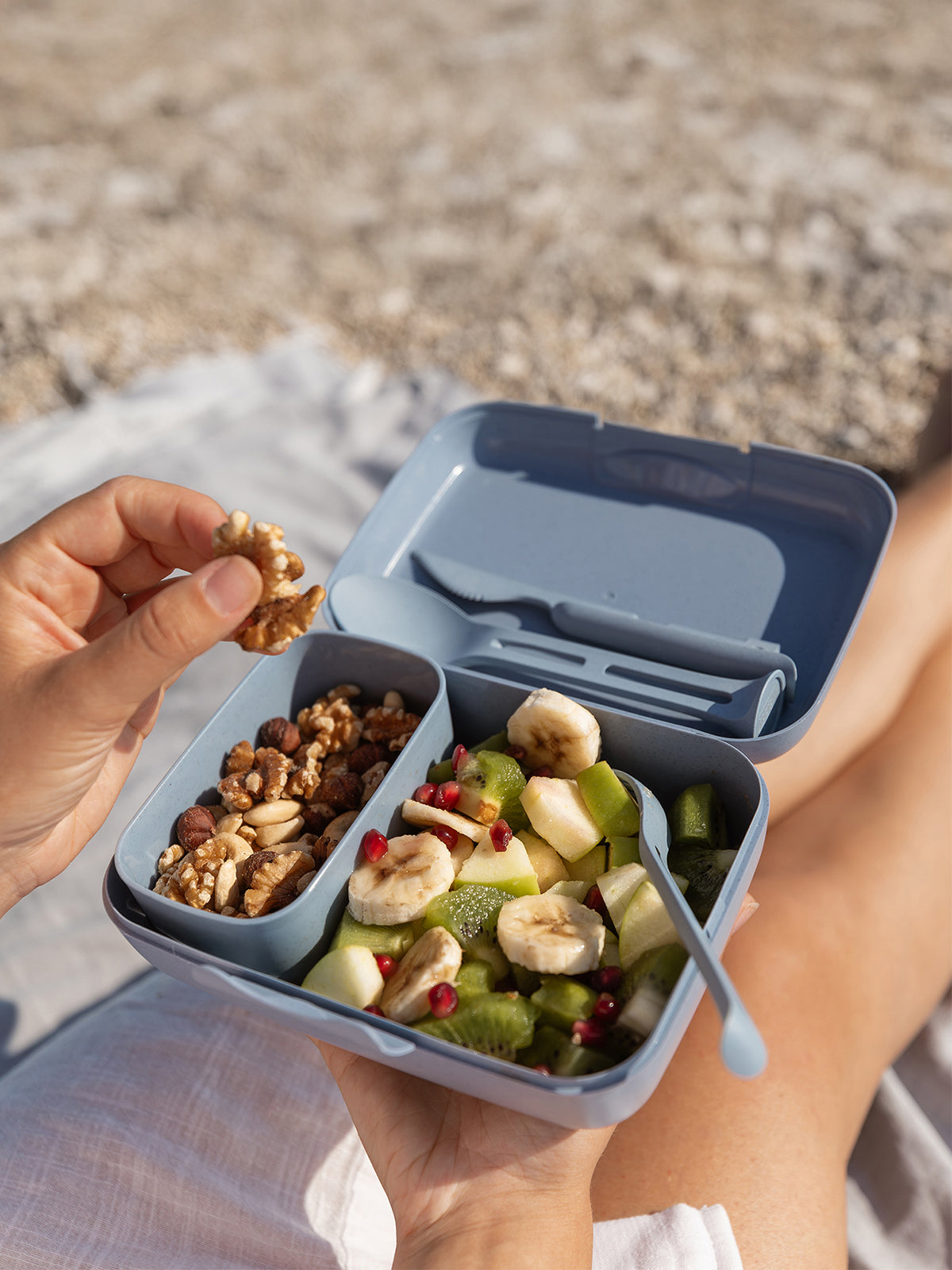 The CANDY READY lunchbox set has everything you need for a healthy lunch on the go. The large CANDY L box and the leak-proof CANDY S container neatly separate salads and dressings, vegetable sticks and dip, sandwiches, and fruit, keeping food appealing until eaten. The KLIKK POCKET cutlery set also fits in the large box, perfectly rounding off the lunchbox set.