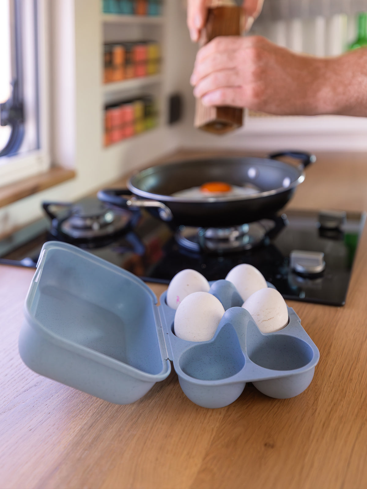 EGGS TO GO MINI fits even in small refrigerators or coolers and safely stores up to six eggs. It features a practical clip closure for easy opening and closing, and the shock-resistant material reliably prevents the eggs from being damaged or crushed.