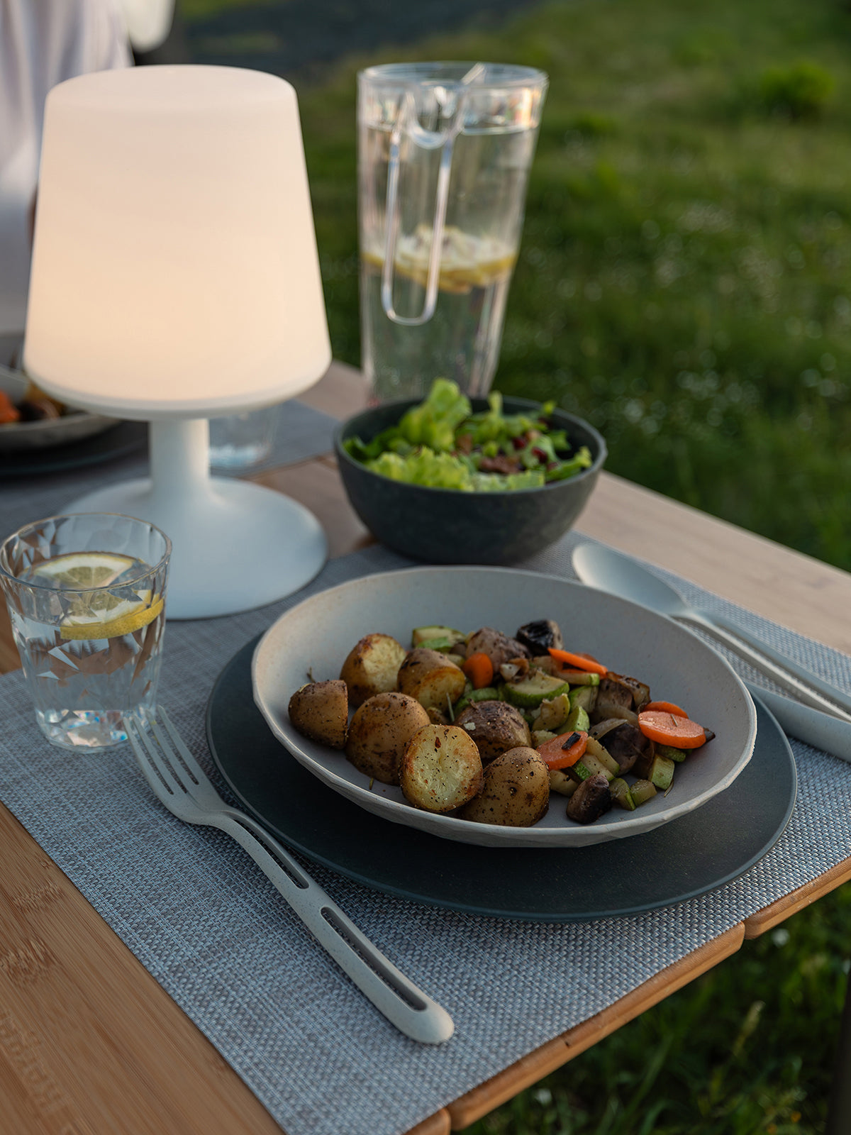 Dinner for two. CLUB SKAGEN is the perfect tableware set for minimalist camping or a romantic picnic for lovers. The plates and bowls with their faceted design blend harmoniously into any setting, impressing both indoors and outdoors with their solid quality and extremely cool look. The sparkling cups are durable, comfortable to hold, and stackable for a particularly space-saving fit. The compact KLIKK cutlery perfectly rounds off the tableware set. The CLUB SET SKAGEN is robust, lightweight, and stackable, making it an indispensable companion for all outdoor activities.