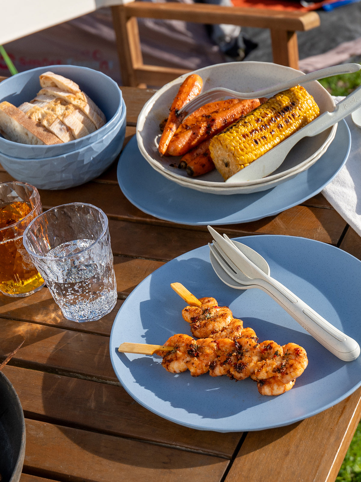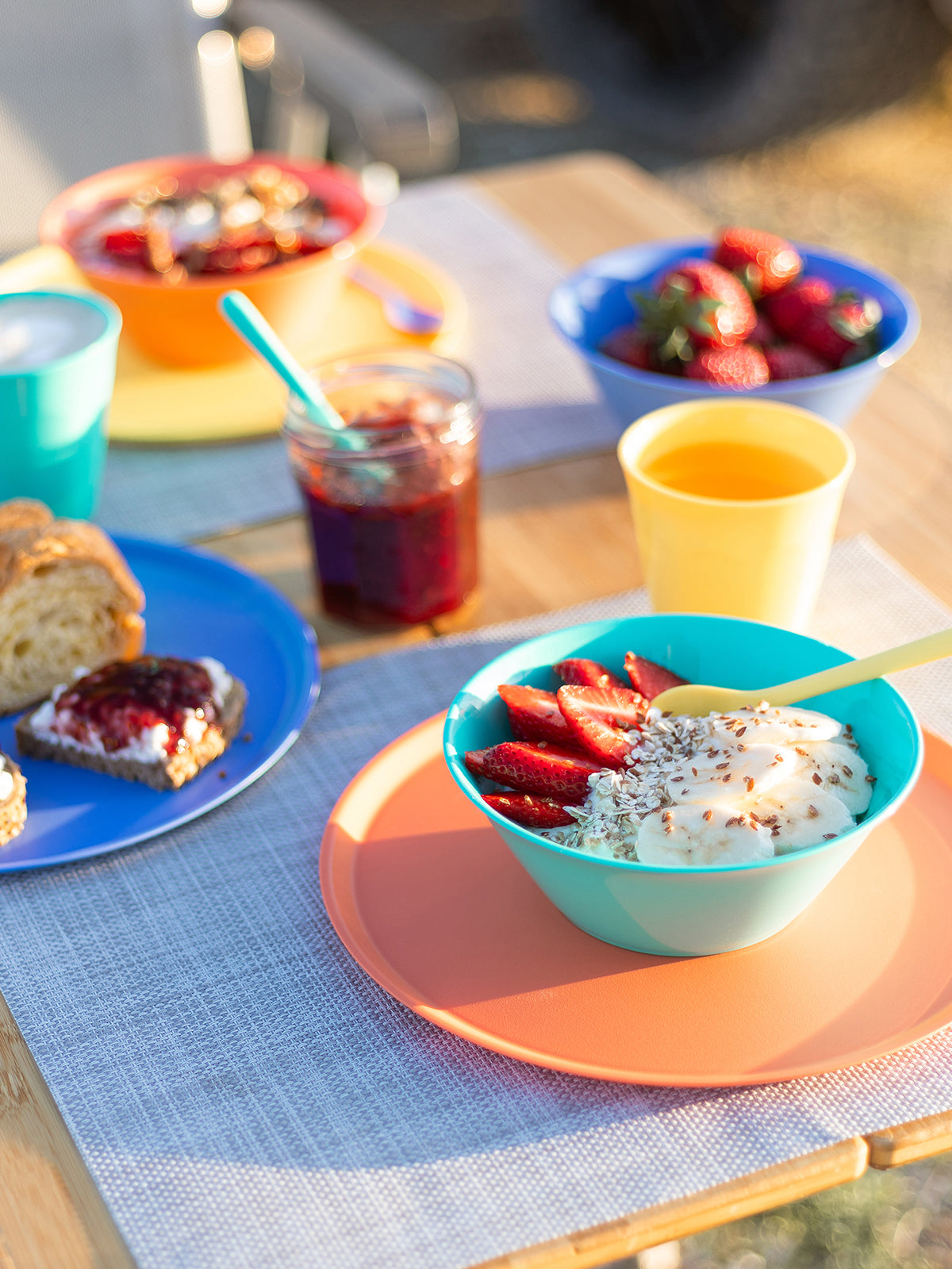 The versatile tableware for picnics, camping, and all occasions that preferably take place outdoors. The faceted plates are like a fresh summer breeze at an outdoor lunch, conveying the good feeling of high-quality dining anytime and anywhere. The compact bowl is just the right size for popular bowl recipes and also makes a great addition to fruit, salads, desserts, or soups. The material stays beautiful for a long time and is, of course, dishwasher safe.