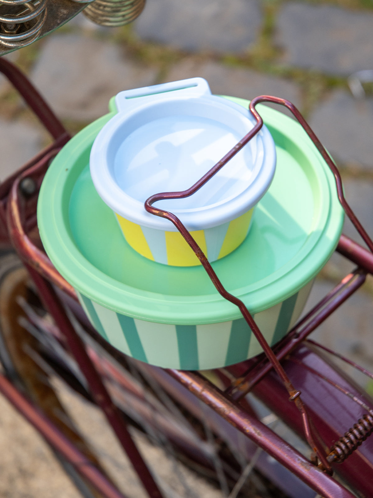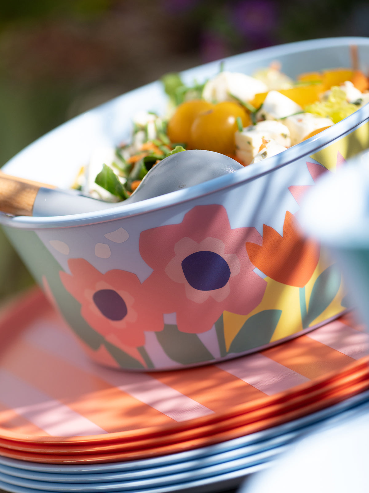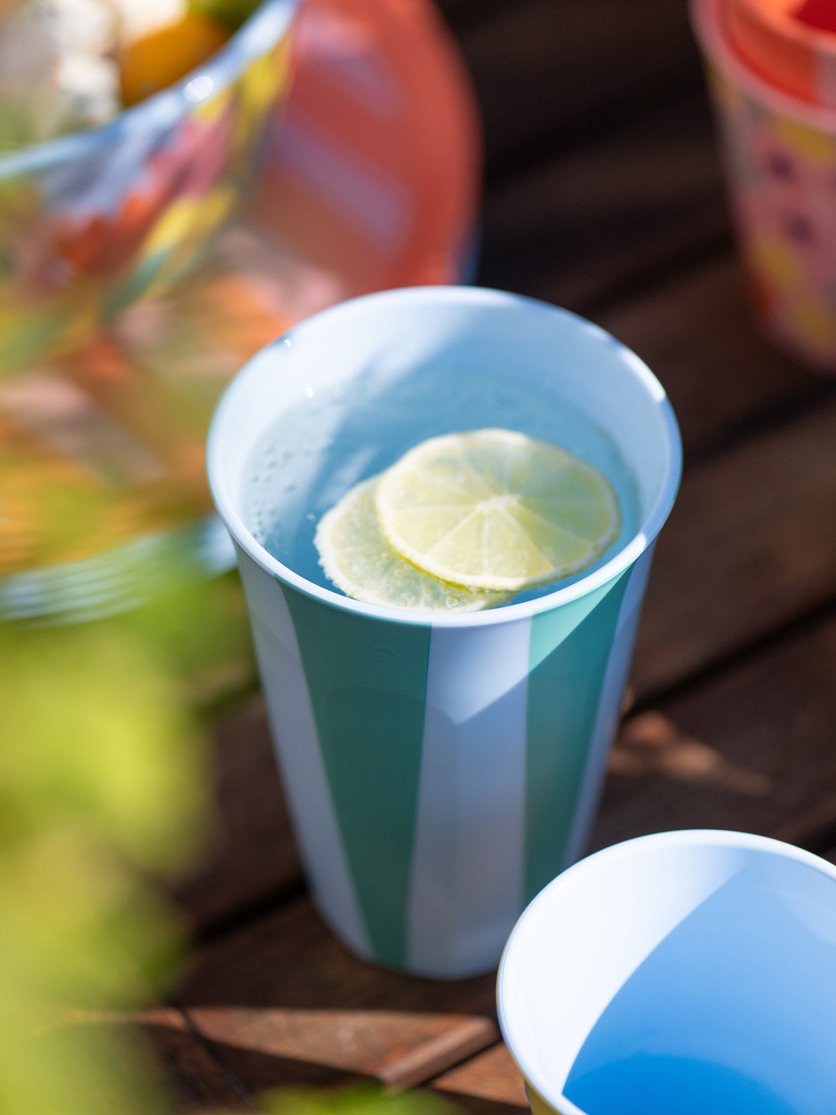 The NORA SET LOLLIPOP is pure joie de vivre, and the cups, bowls, plates, and spoons can be combined to your heart's content. The small plate is ideal for fruit, snacks, or cakes, and the small bowl quickly becomes indispensable for cereal or desserts. The small cup has a pleasant feel and fits comfortably in the hand. Everything is stackable, lightweight, and shatterproof, making it perfect for garden parties, picnics, or camping.