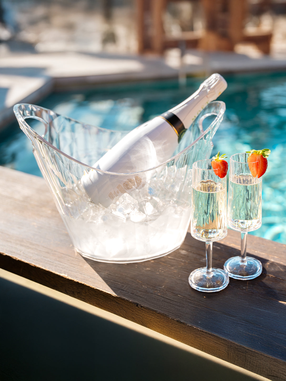 CLUB BUCKET ist der der strahlende Mittelpunkt eines jeden Festes. Der ausladende Sektkühler nimmt 1-2 Flaschen auf und sorgt mit Eis befüllt für erfrischend temperierte Getränke. Die beiden Stege auf dem Boden verhindern ein Wegrutschen des Inhalts und sorgen für eine optimale Präsentation der edlen Flaschen. Die beiden Griffmulden sind ergonomisch geformt und der gefüllte Flaschenkühler lässt sich dadurch sehr angenehm transportieren. CLUB BUCKET ist platzsparend stapelbar und ein Musthave für jede Bar.