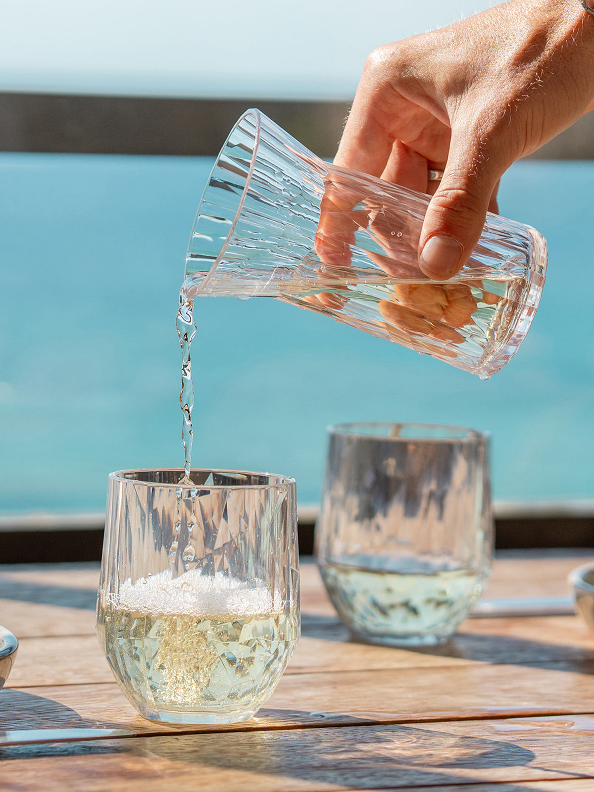 Der große Pitcher ist ein echtes Allround-Talent und ideal zum Servieren von Welcome-Drinks oder Infused Water. Die Karaffe fasst 1,5 Liter und ist sogar platzsparend stapelbar. Der Deckel besitzt zwei unterschiedliche Gießöffnungen, so bleiben Eiswürfel und Zitronenscheiben zuverlässig drin. Dreht man den Deckel um 90 Grad, wird der Krug komplett verschlossen und der Inhalt ist gut geschützt.