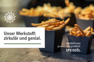 Unser Werkstoff ist kein gewöhnliches Material – er ist biozirkulär, ressourcenschonend und absolut einzigartig. Hergestellt aus recycelten Speiseölen aus Gastronomie und Lebensmittelindustrie, braucht er bis zu 90 % weniger Energie als Metall oder Keramik. Natürlich frei von Melamin, hundertprozentig recycelbar und bereit für morgen.