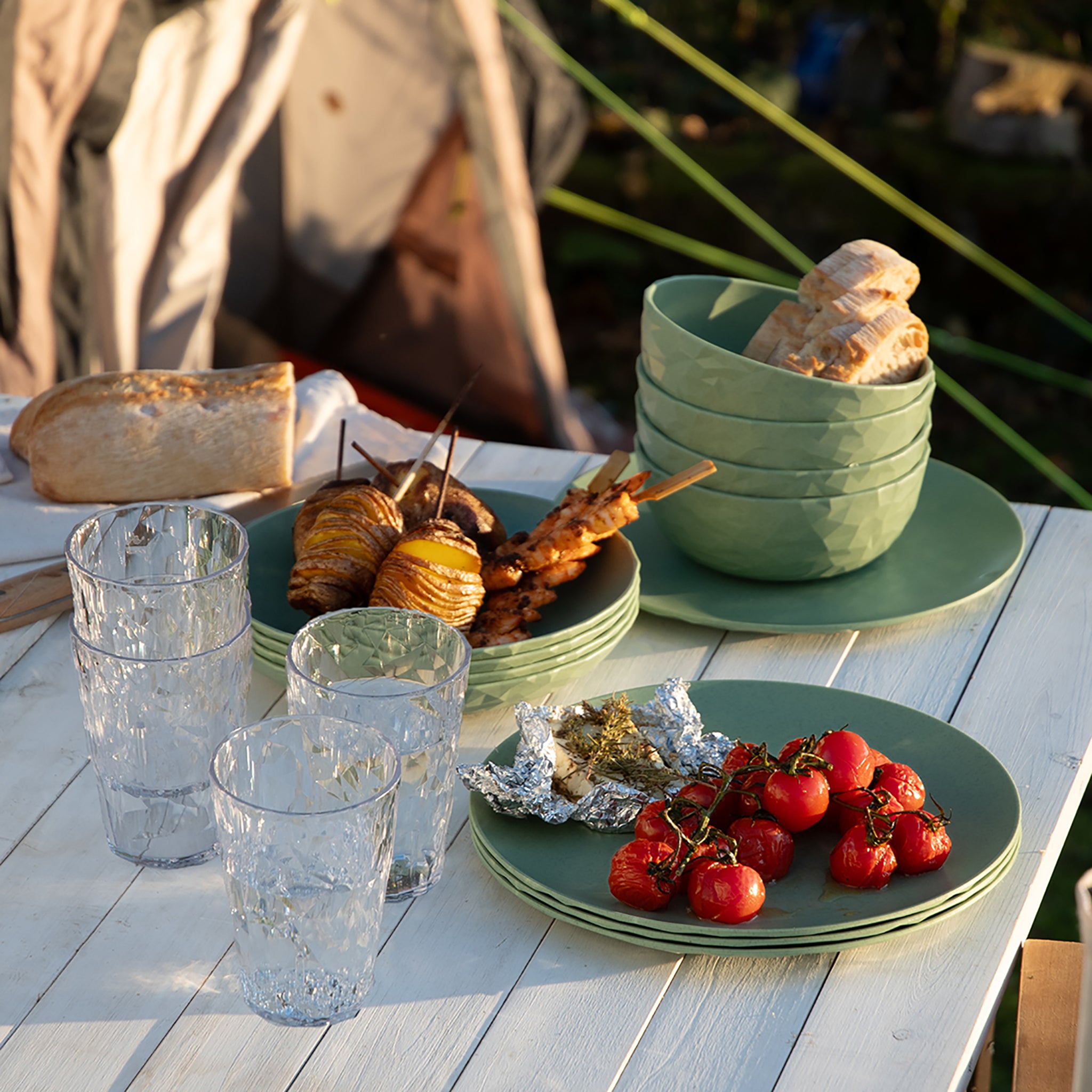 Die facettierten Teller sind wie eine frische Sommerbrise beim Outdoor-Lunch oder Terrassen-Dinner und halten auch turbulenten Feiern ohne jeden Scherbenhaufen stand. Ihre solide Materialität und die modernen Farben vermitteln stets das gute Gefühl eines schön gedeckten Tisches und bleiben dank ihrer schweren Qualität selbst bei einem kräftigen Windstoß stets standfest.